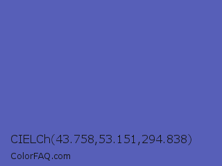 CIELCh 43.758,53.151,294.838 Color is a normal blue color and the nearest color is Blue Violet #6456b7. Hex code #575fb8 and RGB value is rgb(87,95,184). In RGB color space, this color is composed of 34% red, 37% green, 72% blue, In CMYK color space, this color is composed of 53% cyan, 48% magenta, 0% yellow , 28% black , In HSL color space, this color has a hue angle of 235° , 41% saturation and 53% lightness.