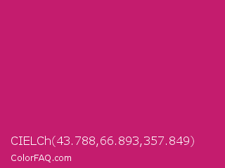 CIELCh 43.788,66.893,357.849 Color is a normal rose color and the nearest color is Magenta Dye #ca1f7b. Hex code #c41c6e and RGB value is rgb(196,28,110). In RGB color space, this color is composed of 77% red, 11% green, 43% blue, In CMYK color space, this color is composed of 0% cyan, 86% magenta, 44% yellow , 23% black , In HSL color space, this color has a hue angle of 331° , 75% saturation and 44% lightness.