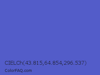 CIELCh 43.815,64.854,296.537 Color is a normal blue color and the nearest color is Indigo #4f69c6. Hex code #535cc9 and RGB value is rgb(83,92,201). In RGB color space, this color is composed of 33% red, 36% green, 79% blue, In CMYK color space, this color is composed of 59% cyan, 54% magenta, 0% yellow , 21% black , In HSL color space, this color has a hue angle of 235° , 52% saturation and 56% lightness.
