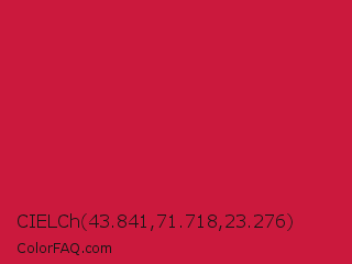 CIELCh 43.841,71.718,23.276 Color is a normal red color and the nearest color is Cardinal #c41e3a. Hex code #cb193d and RGB value is rgb(203,25,61). In RGB color space, this color is composed of 80% red, 10% green, 24% blue, In CMYK color space, this color is composed of 0% cyan, 88% magenta, 70% yellow , 20% black , In HSL color space, this color has a hue angle of 348° , 78% saturation and 45% lightness.