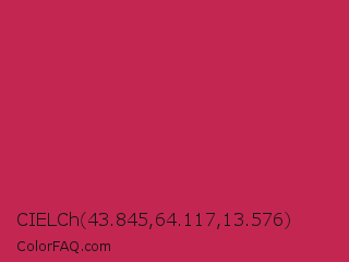CIELCh 43.845,64.117,13.576 Color is a normal rose color and the nearest color is Rose Red #c21e56. Hex code #c42652 and RGB value is rgb(196,38,82). In RGB color space, this color is composed of 77% red, 15% green, 32% blue, In CMYK color space, this color is composed of 0% cyan, 81% magenta, 58% yellow , 23% black , In HSL color space, this color has a hue angle of 343° , 68% saturation and 46% lightness.