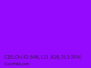 CIELCh 43.848,121.828,313.504 Color is a normal purple color and the nearest color is Electric Violet #8f00ff. Hex code #940aff and RGB value is rgb(148,10,255). In RGB color space, this color is composed of 58% red, 4% green, 100% blue, In CMYK color space, this color is composed of 42% cyan, 96% magenta, 0% yellow , 0% black , In HSL color space, this color has a hue angle of 274° , 100% saturation and 52% lightness.
