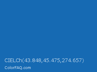 CIELCh 43.848,45.475,274.657 Color is a normal blue color and the nearest color is Green Blue #1164b4. Hex code #166ab3 and RGB value is rgb(22,106,179). In RGB color space, this color is composed of 9% red, 42% green, 70% blue, In CMYK color space, this color is composed of 88% cyan, 41% magenta, 0% yellow , 30% black , In HSL color space, this color has a hue angle of 208° , 78% saturation and 39% lightness.