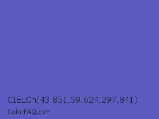 CIELCh 43.851,59.624,297.841 Color is a normal blue color and the nearest color is Blue Violet #6456b7. Hex code #5c5cc0 and RGB value is rgb(92,92,192). In RGB color space, this color is composed of 36% red, 36% green, 75% blue, In CMYK color space, this color is composed of 52% cyan, 52% magenta, 0% yellow , 25% black , In HSL color space, this color has a hue angle of 240° , 44% saturation and 56% lightness.