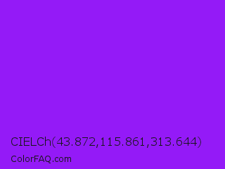 CIELCh 43.872,115.861,313.644 Color is a normal purple color and the nearest color is Veronica #a020f0. Hex code #941af7 and RGB value is rgb(148,26,247). In RGB color space, this color is composed of 58% red, 10% green, 97% blue, In CMYK color space, this color is composed of 40% cyan, 89% magenta, 0% yellow , 3% black , In HSL color space, this color has a hue angle of 273° , 93% saturation and 54% lightness.