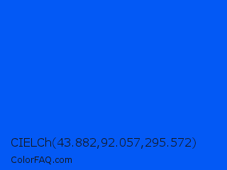 CIELCh 43.882,92.057,295.572 Color is a normal blue color and the nearest color is Blue Ribbon #0066ff. Hex code #0359f5 and RGB value is rgb(3,89,245). In RGB color space, this color is composed of 1% red, 35% green, 96% blue, In CMYK color space, this color is composed of 99% cyan, 64% magenta, 0% yellow , 4% black , In HSL color space, this color has a hue angle of 219° , 98% saturation and 49% lightness.