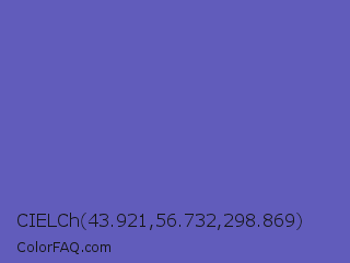 CIELCh 43.921,56.732,298.869 Color is a normal indigo color and the nearest color is Blue Violet #6456b7. Hex code #615cbb and RGB value is rgb(97,92,187). In RGB color space, this color is composed of 38% red, 36% green, 73% blue, In CMYK color space, this color is composed of 48% cyan, 51% magenta, 0% yellow , 27% black , In HSL color space, this color has a hue angle of 243° , 41% saturation and 55% lightness.