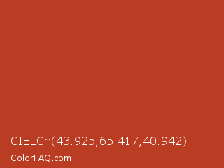 CIELCh 43.925,65.417,40.942 Color is a normal red color and the nearest color is Dark Pastel Red #c23b22. Hex code #ba3c22 and RGB value is rgb(186,60,34). In RGB color space, this color is composed of 73% red, 24% green, 13% blue, In CMYK color space, this color is composed of 0% cyan, 68% magenta, 82% yellow , 27% black , In HSL color space, this color has a hue angle of 10° , 69% saturation and 43% lightness.