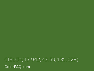 CIELCh 43.942,43.59,131.028 Color is a normal green color and the nearest color is Sap Green #507d2a. Hex code #47732e and RGB value is rgb(71,115,46). In RGB color space, this color is composed of 28% red, 45% green, 18% blue, In CMYK color space, this color is composed of 38% cyan, 0% magenta, 60% yellow , 55% black , In HSL color space, this color has a hue angle of 98° , 43% saturation and 32% lightness.