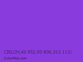 CIELCh 43.952,93.836,312.112 Color is a normal violet color and the nearest color is Blue Violet #8a2be2. Hex code #8a3bde and RGB value is rgb(138,59,222). In RGB color space, this color is composed of 54% red, 23% green, 87% blue, In CMYK color space, this color is composed of 38% cyan, 73% magenta, 0% yellow , 13% black , In HSL color space, this color has a hue angle of 269° , 71% saturation and 55% lightness.