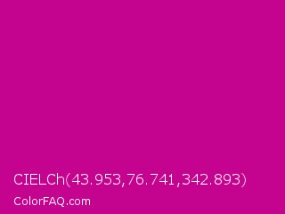 CIELCh 43.953,76.741,342.893 Color is a normal magenta color and the nearest color is Red Violet #c71585. Hex code #c4048f and RGB value is rgb(196,4,143). In RGB color space, this color is composed of 77% red, 2% green, 56% blue, In CMYK color space, this color is composed of 0% cyan, 98% magenta, 27% yellow , 23% black , In HSL color space, this color has a hue angle of 317° , 96% saturation and 39% lightness.