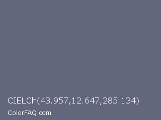 CIELCh 43.957,12.647,285.134 Color is a normal blue color and the nearest color is Dolphin #646077. Hex code #63677c and RGB value is rgb(99,103,124). In RGB color space, this color is composed of 39% red, 40% green, 49% blue, In CMYK color space, this color is composed of 20% cyan, 17% magenta, 0% yellow , 51% black , In HSL color space, this color has a hue angle of 230° , 11% saturation and 44% lightness.