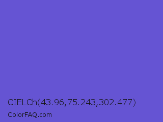CIELCh 43.96,75.243,302.477 Color is a normal indigo color and the nearest color is Slate Blue #6a5acd. Hex code #6554d3 and RGB value is rgb(101,84,211). In RGB color space, this color is composed of 40% red, 33% green, 83% blue, In CMYK color space, this color is composed of 52% cyan, 60% magenta, 0% yellow , 17% black , In HSL color space, this color has a hue angle of 248° , 59% saturation and 58% lightness.