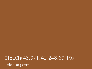 CIELCh 43.971,41.248,59.197 Color is a normal orange color and the nearest color is Potters Clay #8c5738. Hex code #96592d and RGB value is rgb(150,89,45). In RGB color space, this color is composed of 59% red, 35% green, 18% blue, In CMYK color space, this color is composed of 0% cyan, 41% magenta, 70% yellow , 41% black , In HSL color space, this color has a hue angle of 25° , 54% saturation and 38% lightness.