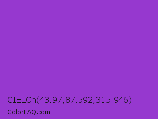 CIELCh 43.97,87.592,315.946 Color is a normal purple color and the nearest color is Dark Orchid #9932cc. Hex code #9638cf and RGB value is rgb(150,56,207). In RGB color space, this color is composed of 59% red, 22% green, 81% blue, In CMYK color space, this color is composed of 28% cyan, 73% magenta, 0% yellow , 19% black , In HSL color space, this color has a hue angle of 277° , 61% saturation and 52% lightness.