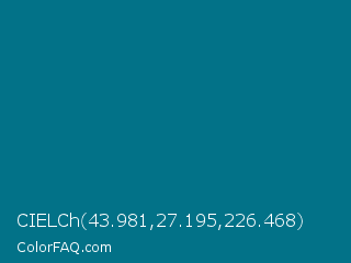 CIELCh 43.981,27.195,226.468 Color is a dark cyan color and the nearest color is Blue Lagoon #017987. Hex code #027288 and RGB value is rgb(2,114,136). In RGB color space, this color is composed of 1% red, 45% green, 53% blue, In CMYK color space, this color is composed of 99% cyan, 16% magenta, 0% yellow , 47% black , In HSL color space, this color has a hue angle of 190° , 97% saturation and 27% lightness.