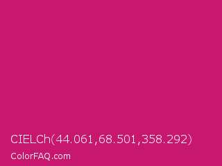 CIELCh 44.061,68.501,358.292 Color is a normal rose color and the nearest color is Magenta Dye #ca1f7b. Hex code #c7176e and RGB value is rgb(199,23,110). In RGB color space, this color is composed of 78% red, 9% green, 43% blue, In CMYK color space, this color is composed of 0% cyan, 88% magenta, 45% yellow , 22% black , In HSL color space, this color has a hue angle of 330° , 79% saturation and 44% lightness.