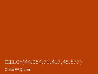 CIELCh 44.064,71.417,48.577 Color is a normal orange color and the nearest color is Rust #b7410e. Hex code #b93f06 and RGB value is rgb(185,63,6). In RGB color space, this color is composed of 73% red, 25% green, 2% blue, In CMYK color space, this color is composed of 0% cyan, 66% magenta, 97% yellow , 27% black , In HSL color space, this color has a hue angle of 19° , 94% saturation and 37% lightness.