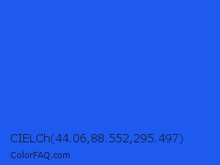 CIELCh 44.06,88.552,295.497 Color is a normal blue color and the nearest color is Blue Crayola #1f75fe. Hex code #1e5af0 and RGB value is rgb(30,90,240). In RGB color space, this color is composed of 12% red, 35% green, 94% blue, In CMYK color space, this color is composed of 88% cyan, 63% magenta, 0% yellow , 6% black , In HSL color space, this color has a hue angle of 223° , 88% saturation and 53% lightness.