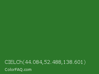 CIELCh 44.084,52.488,138.601 Color is a normal green color and the nearest color is Bilbao #327c14. Hex code #2c772a and RGB value is rgb(44,119,42). In RGB color space, this color is composed of 17% red, 47% green, 16% blue, In CMYK color space, this color is composed of 63% cyan, 0% magenta, 65% yellow , 53% black , In HSL color space, this color has a hue angle of 118° , 48% saturation and 32% lightness.