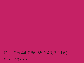CIELCh 44.086,65.343,3.116 Color is a normal rose color and the nearest color is Rose Red #c21e56. Hex code #c52165 and RGB value is rgb(197,33,101). In RGB color space, this color is composed of 77% red, 13% green, 40% blue, In CMYK color space, this color is composed of 0% cyan, 83% magenta, 49% yellow , 23% black , In HSL color space, this color has a hue angle of 335° , 71% saturation and 45% lightness.