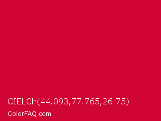 CIELCh 44.093,77.765,26.75 Color is a normal red color and the nearest color is Vivid Crimson #cc0033. Hex code #d10533 and RGB value is rgb(209,5,51). In RGB color space, this color is composed of 82% red, 2% green, 20% blue, In CMYK color space, this color is composed of 0% cyan, 98% magenta, 76% yellow , 18% black , In HSL color space, this color has a hue angle of 346° , 95% saturation and 42% lightness.