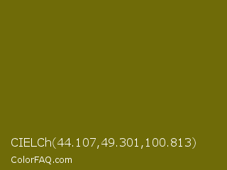 CIELCh 44.107,49.301,100.813 Color is a dark yellow color and the nearest color is Olivetone #716e10. Hex code #6f6b08 and RGB value is rgb(111,107,8). In RGB color space, this color is composed of 44% red, 42% green, 3% blue, In CMYK color space, this color is composed of 0% cyan, 4% magenta, 93% yellow , 56% black , In HSL color space, this color has a hue angle of 58° , 87% saturation and 23% lightness.
