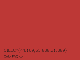 CIELCh 44.109,61.838,31.389 Color is a normal red color and the nearest color is International Orange Golden Gate Bridge #c0362c. Hex code #bd3836 and RGB value is rgb(189,56,54). In RGB color space, this color is composed of 74% red, 22% green, 21% blue, In CMYK color space, this color is composed of 0% cyan, 70% magenta, 71% yellow , 26% black , In HSL color space, this color has a hue angle of 1° , 56% saturation and 48% lightness.