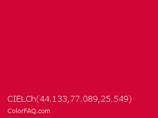 CIELCh 44.133,77.089,25.549 Color is a normal red color and the nearest color is Vivid Crimson #cc0033. Hex code #d10536 and RGB value is rgb(209,5,54). In RGB color space, this color is composed of 82% red, 2% green, 21% blue, In CMYK color space, this color is composed of 0% cyan, 98% magenta, 74% yellow , 18% black , In HSL color space, this color has a hue angle of 346° , 95% saturation and 42% lightness.
