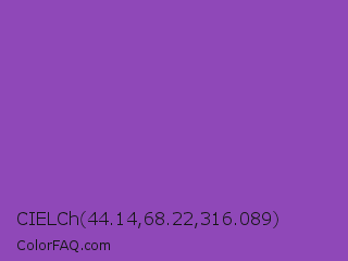 CIELCh 44.14,68.22,316.089 Color is a normal purple color and the nearest color is Purple Plum #9c51b6. Hex code #8f48b8 and RGB value is rgb(143,72,184). In RGB color space, this color is composed of 56% red, 28% green, 72% blue, In CMYK color space, this color is composed of 22% cyan, 61% magenta, 0% yellow , 28% black , In HSL color space, this color has a hue angle of 278° , 44% saturation and 50% lightness.