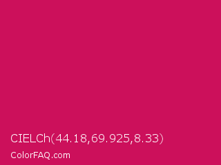 CIELCh 44.18,69.925,8.33 Color is a normal rose color and the nearest color is Debian Red #d70a53. Hex code #cc105b and RGB value is rgb(204,16,91). In RGB color space, this color is composed of 80% red, 6% green, 36% blue, In CMYK color space, this color is composed of 0% cyan, 92% magenta, 55% yellow , 20% black , In HSL color space, this color has a hue angle of 336° , 85% saturation and 43% lightness.