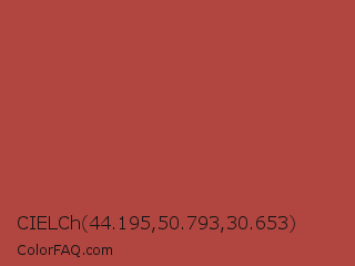 CIELCh 44.195,50.793,30.653 Color is a normal red color and the nearest color is Apple Blossom #af4d43. Hex code #b14540 and RGB value is rgb(177,69,64). In RGB color space, this color is composed of 69% red, 27% green, 25% blue, In CMYK color space, this color is composed of 0% cyan, 61% magenta, 64% yellow , 31% black , In HSL color space, this color has a hue angle of 3° , 47% saturation and 47% lightness.