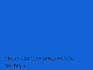CIELCh 44.1,68.698,288.524 Color is a normal blue color and the nearest color is Bright Navy Blue #1974d2. Hex code #1263d6 and RGB value is rgb(18,99,214). In RGB color space, this color is composed of 7% red, 39% green, 84% blue, In CMYK color space, this color is composed of 92% cyan, 54% magenta, 0% yellow , 16% black , In HSL color space, this color has a hue angle of 215° , 84% saturation and 45% lightness.
