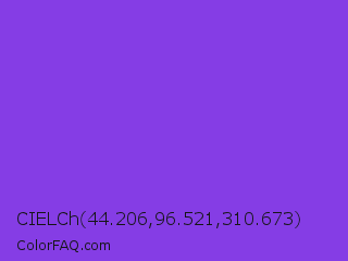 CIELCh 44.206,96.521,310.673 Color is a normal violet color and the nearest color is Blue Violet #8a2be2. Hex code #853de5 and RGB value is rgb(133,61,229). In RGB color space, this color is composed of 52% red, 24% green, 90% blue, In CMYK color space, this color is composed of 42% cyan, 73% magenta, 0% yellow , 10% black , In HSL color space, this color has a hue angle of 266° , 76% saturation and 57% lightness.