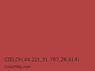 CIELCh 44.221,51.787,28.614 Color is a normal red color and the nearest color is Apple Blossom #af4d43. Hex code #b34342 and RGB value is rgb(179,67,66). In RGB color space, this color is composed of 70% red, 26% green, 26% blue, In CMYK color space, this color is composed of 0% cyan, 63% magenta, 63% yellow , 30% black , In HSL color space, this color has a hue angle of 1° , 46% saturation and 48% lightness.