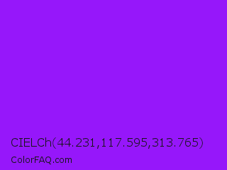 CIELCh 44.231,117.595,313.765 Color is a normal purple color and the nearest color is Veronica #a020f0. Hex code #9617fa and RGB value is rgb(150,23,250). In RGB color space, this color is composed of 59% red, 9% green, 98% blue, In CMYK color space, this color is composed of 40% cyan, 91% magenta, 0% yellow , 2% black , In HSL color space, this color has a hue angle of 274° , 96% saturation and 54% lightness.