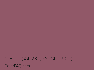 CIELCh 44.231,25.74,1.909 Color is a normal rose color and the nearest color is Mauve Taupe #915f6d. Hex code #915868 and RGB value is rgb(145,88,104). In RGB color space, this color is composed of 57% red, 35% green, 41% blue, In CMYK color space, this color is composed of 0% cyan, 39% magenta, 28% yellow , 43% black , In HSL color space, this color has a hue angle of 343° , 24% saturation and 46% lightness.