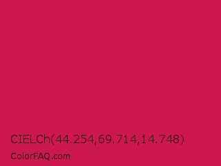 CIELCh 44.254,69.714,14.748 Color is a normal rose color and the nearest color is Rose Red #c21e56. Hex code #cc174f and RGB value is rgb(204,23,79). In RGB color space, this color is composed of 80% red, 9% green, 31% blue, In CMYK color space, this color is composed of 0% cyan, 89% magenta, 61% yellow , 20% black , In HSL color space, this color has a hue angle of 341° , 80% saturation and 45% lightness.