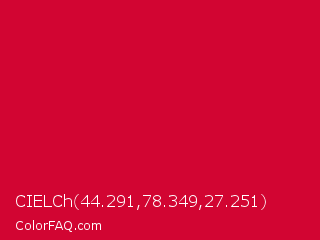 CIELCh 44.291,78.349,27.251 Color is a normal red color and the nearest color is Vivid Crimson #cc0033. Hex code #d20532 and RGB value is rgb(210,5,50). In RGB color space, this color is composed of 82% red, 2% green, 20% blue, In CMYK color space, this color is composed of 0% cyan, 98% magenta, 76% yellow , 18% black , In HSL color space, this color has a hue angle of 347° , 95% saturation and 42% lightness.