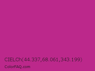CIELCh 44.337,68.061,343.199 Color is a normal magenta color and the nearest color is Medium Red Violet #bb3385. Hex code #bc288b and RGB value is rgb(188,40,139). In RGB color space, this color is composed of 74% red, 16% green, 55% blue, In CMYK color space, this color is composed of 0% cyan, 79% magenta, 26% yellow , 26% black , In HSL color space, this color has a hue angle of 320° , 65% saturation and 45% lightness.