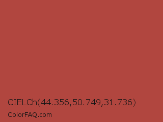 CIELCh 44.356,50.749,31.736 Color is a normal red color and the nearest color is Apple Blossom #af4d43. Hex code #b1463f and RGB value is rgb(177,70,63). In RGB color space, this color is composed of 69% red, 27% green, 25% blue, In CMYK color space, this color is composed of 0% cyan, 60% magenta, 64% yellow , 31% black , In HSL color space, this color has a hue angle of 4° , 48% saturation and 47% lightness.