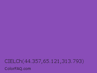 CIELCh 44.357,65.121,313.793 Color is a normal purple color and the nearest color is Deep Lilac #9955bb. Hex code #894db8 and RGB value is rgb(137,77,184). In RGB color space, this color is composed of 54% red, 30% green, 72% blue, In CMYK color space, this color is composed of 26% cyan, 58% magenta, 0% yellow , 28% black , In HSL color space, this color has a hue angle of 274° , 43% saturation and 51% lightness.