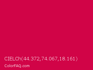 CIELCh 44.372,74.067,18.161 Color is a normal rose color and the nearest color is Spanish Carmine #d10047. Hex code #d10447 and RGB value is rgb(209,4,71). In RGB color space, this color is composed of 82% red, 2% green, 28% blue, In CMYK color space, this color is composed of 0% cyan, 98% magenta, 66% yellow , 18% black , In HSL color space, this color has a hue angle of 340° , 96% saturation and 42% lightness.