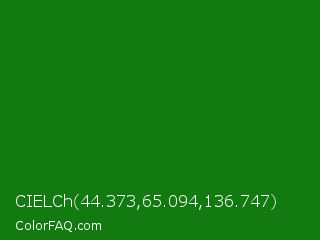 CIELCh 44.373,65.094,136.747 Color is a dark green color and the nearest color is India Green #138808. Hex code #137a11 and RGB value is rgb(19,122,17). In RGB color space, this color is composed of 7% red, 48% green, 7% blue, In CMYK color space, this color is composed of 84% cyan, 0% magenta, 86% yellow , 52% black , In HSL color space, this color has a hue angle of 119° , 76% saturation and 27% lightness.