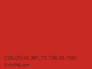 CIELCh 44.387,75.738,36.766 Color is a normal red color and the nearest color is Thunderbird #c02b18. Hex code #c92920 and RGB value is rgb(201,41,32). In RGB color space, this color is composed of 79% red, 16% green, 13% blue, In CMYK color space, this color is composed of 0% cyan, 80% magenta, 84% yellow , 21% black , In HSL color space, this color has a hue angle of 3° , 73% saturation and 46% lightness.