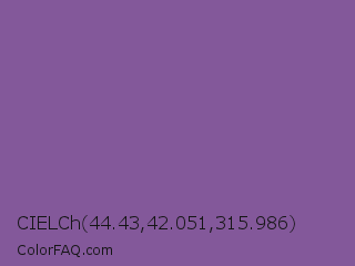 CIELCh 44.43,42.051,315.986 Color is a normal purple color and the nearest color is French Lilac #86608e. Hex code #83589a and RGB value is rgb(131,88,154). In RGB color space, this color is composed of 51% red, 35% green, 60% blue, In CMYK color space, this color is composed of 15% cyan, 43% magenta, 0% yellow , 40% black , In HSL color space, this color has a hue angle of 279° , 27% saturation and 47% lightness.