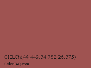 CIELCh 44.449,34.782,26.375 Color is a normal red color and the nearest color is Middle Red Purple #a55353. Hex code #9f5351 and RGB value is rgb(159,83,81). In RGB color space, this color is composed of 62% red, 33% green, 32% blue, In CMYK color space, this color is composed of 0% cyan, 48% magenta, 49% yellow , 38% black , In HSL color space, this color has a hue angle of 2° , 33% saturation and 47% lightness.