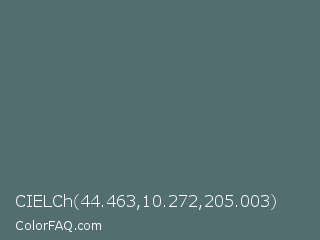 CIELCh 44.463,10.272,205.003 Color is a normal cyan color and the nearest color is Cadet #536872. Hex code #536e70 and RGB value is rgb(83,110,112). In RGB color space, this color is composed of 33% red, 43% green, 44% blue, In CMYK color space, this color is composed of 26% cyan, 2% magenta, 0% yellow , 56% black , In HSL color space, this color has a hue angle of 184° , 15% saturation and 38% lightness.