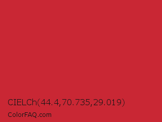 CIELCh 44.4,70.735,29.019 Color is a normal red color and the nearest color is Cardinal #c41e3a. Hex code #c92734 and RGB value is rgb(201,39,52). In RGB color space, this color is composed of 79% red, 15% green, 20% blue, In CMYK color space, this color is composed of 0% cyan, 81% magenta, 74% yellow , 21% black , In HSL color space, this color has a hue angle of 355° , 68% saturation and 47% lightness.