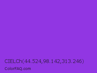 CIELCh 44.524,98.142,313.246 Color is a normal purple color and the nearest color is Blue Violet #8a2be2. Hex code #9136e3 and RGB value is rgb(145,54,227). In RGB color space, this color is composed of 57% red, 21% green, 89% blue, In CMYK color space, this color is composed of 36% cyan, 76% magenta, 0% yellow , 11% black , In HSL color space, this color has a hue angle of 272° , 76% saturation and 55% lightness.
